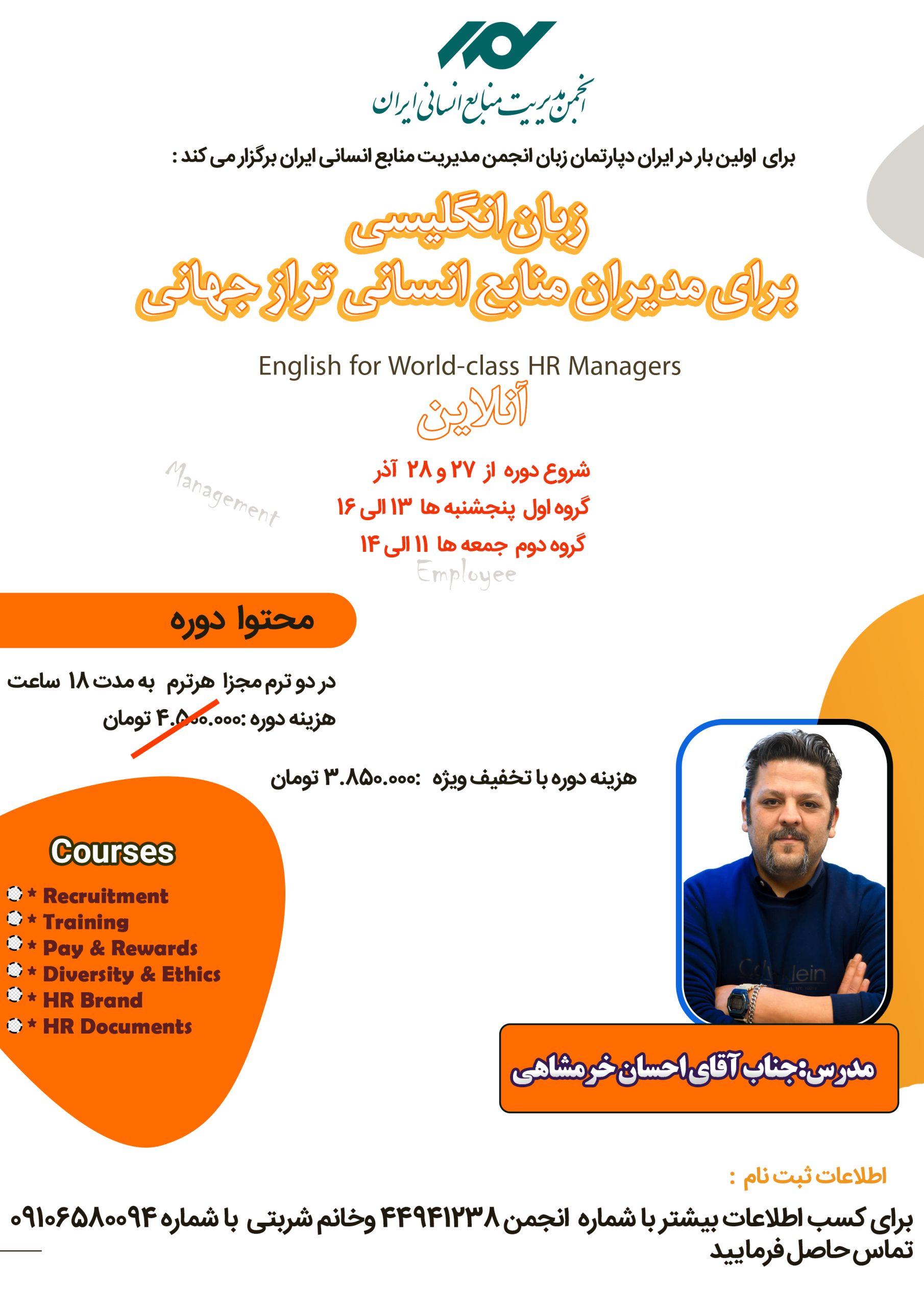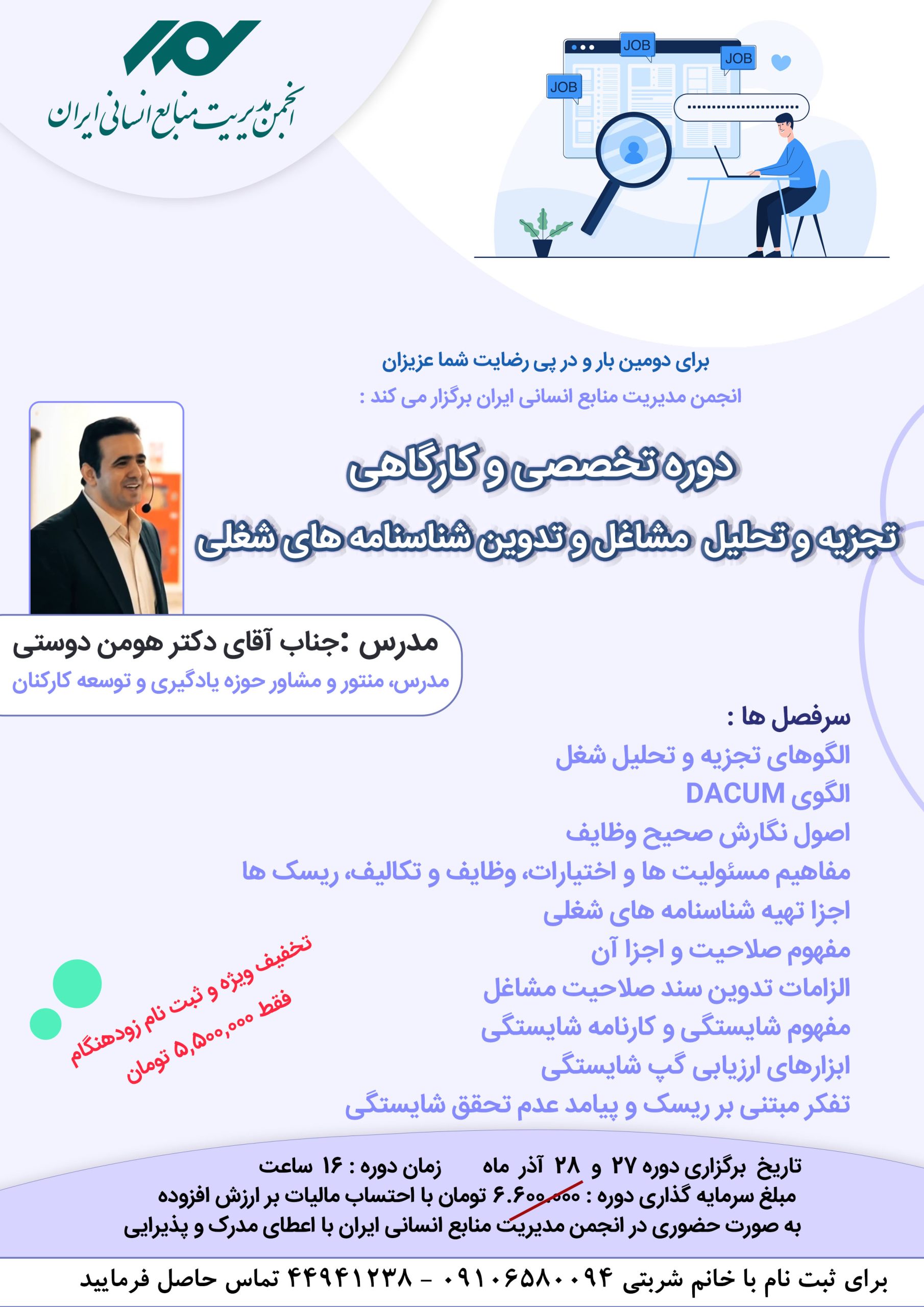 جستجوی محصولات جستجو دوره های آموزشی بیست و پنجمین دوره ۸۸ ساعته مدیریت حرفه ای منابع انسانی (گروه ۲۵) مدت :۸۸ ساعت قیمت دوره : ۱۸.۷۰۰.۰۰۰ تومان (با احتساب مالیات ارزش افزوده) با تخفیف ویژه فقط تا ۲۵ آذر ماه ۱۷.۶۰۰.۰۰۰ تومان برای پرداخت قسطی لطفا با خانم شربتی ۰۹۱۰۶۵۸۰۰۹۴ تماس حاصل فرمایید . دوره آموزشی تربیت مدرس حرفه ای مدت : ۱۶ ساعت دوره اموزشی به همراه پرسش و پاسخ با شما عزیزان کار عملی استاد: دکتر هومن دوستی قیمت دوره : ۶.۶۰۰.۰۰۰ تومان (با احتساب مالیات ارزش افزوده) دوره آموزشی کارگاه تجزیه تحلیل شغل و تدوین شناسنامه های شغلی مدت : ۱۶ ساعت دوره اموزشی به همراه پرسش و پاسخ با شما عزیزان کار عملی استاد: دکتر هومن دوستی (مدرس و منتور حوزه یادگیری و آموزش کارکنان) با تجربه بیش از ۱۰۰۰۰ آنالیز شغلی قیمت دوره : ۶.۶۰۰.۰۰۰ تومان (با احتساب مالیات ارزش افزوده) با تخفیف ویژه ۵.۵۰۰.۰۰۰ آیین نگارش و مکاتبات اداری مدت : ۶ ساعت قیمت دوره : ۱.۴۳۰.۰۰۰ تومان (با احتساب مالیات ارزش افزوده) دوره آموزشی کارگاه مصاحبه شایستگی محور مدت : ۸ ساعت دوره اموزشی به همراه پرسش و پاسخ با شما عزیزان کار عملی استاد: دکتر نیما فرامرز (مدرس برتر حوزه استخدام و کانون ارزیابی ) قیمت دوره : ۴.۴۰۰.۰۰۰ تومان (با احتساب مالیات ارزش افزوده) کارگاه پیاده سازی استاندارد ایزو ۱۰۰۱۵ ورژن ۲۰۱۹ مدت :۸ ساعت استاد: دکتر سعید صفایی موحد قیمت دوره : ۲.۲۰۰.۰۰۰ تومان دوره آموزشی مدیریت استعداد و جانشین پروری بر اساس مدل دیلویت مدت : ۸ ساعت دوره اموزشی به همراه پرسش و پاسخ با شما عزیزان کار عملی استاد: دکتر علی داوری قیمت دوره : ۳.۳۰۰.۰۰۰ تومان (با احتساب مالیات ارزش افزوده) دوره تخصصی پرورش تحلیلگر منابع انسانی مدت :۲۴ ساعت استاد: دکتر خلیل میرخانی قیمت دوره : ۴.۴۰۰.۰۰۰ تومان(با احتساب مالیات ارزش افزوده ) با تخفیف ویژه ۳.۸۵۰.۰۰۰ دوره حرفه ای بین المللی منابع انسانیPHRi مدت :۴۲ ساعت استاد: جناب آقای دکتر باستانی پور قیمت دوره : ۹.۹۰۰.۰۰۰ تومان(با احتساب مالیات ارزش افزوده ) کارگاه کاربردی قانون کار و تامین اجتماعی مدت :۱۶ ساعت استاد: دکتر جعفر زنگنه قیمت دوره : ۷.۷۰۰.۰۰۰ تومان (با تخفیف ویژه : ۶۶۰۰۰۰۰ تومان(با احتساب مالیات ارزش افزوده ) تدوین گام به گام استراتژی منابع انسانی پیشرفته مدت : ۱۶ ساعت قیمت دوره : ۲۸۶۰۰۰۰ تومان تجزیه تحلیل شغل ،طبقه بندی مشاغل و حقوق دستمزد و جبران خدمات مدت : ۱۶ ساعت دوره اموزشی صفر تا صد کارگاهی استاد: دکتر جبار باباشاهی قیمت دوره : ۵.۵۰۰.۰۰۰ تومان (با احتساب مالیات ارزش افزوده) «نقشهبرداری از فرهنگ سازمانی» آشنایی با بوم طراحی فرهنگ مدت : ۹۰ دقیقه وبینار تخصصی استاد: دکتر افشین دبیری برای اعضا انجمن : فقط ۳۸۵ هزارتومان زبان انگلیسی برای مدیران منابع انسانی تراز جهانی مدت :۲۲ ساعت استاد: جناب اقای احسان خرمشاهی قیمت دوره : ۴.۵۰۰.۰۰۰ تومان با تخفیف ویژه ۳.۸۵۰.۰۰۰ تومان دوره تخصصی توسعه مهارتهای جدید در آموزش و یادگیری نوین سازمانی مدت :۱۸ ساعت استاد: دکتر خلیل میرخانی قیمت دوره : ۳.۸۵۰.۰۰۰ تومان کاربردهای هوش مصنوعی در مدیریت سازمان و منابع انسانی مدت :۶ ساعت استاد: شهرام کریمی قیمت دوره : ۳.۰۰۰.۰۰۰ تومان(با احتساب مالیات ارزش افزوده )
